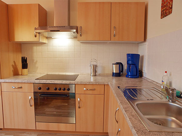 - komplett eingerichtete Küche mit Kühlschrank und E-Herd